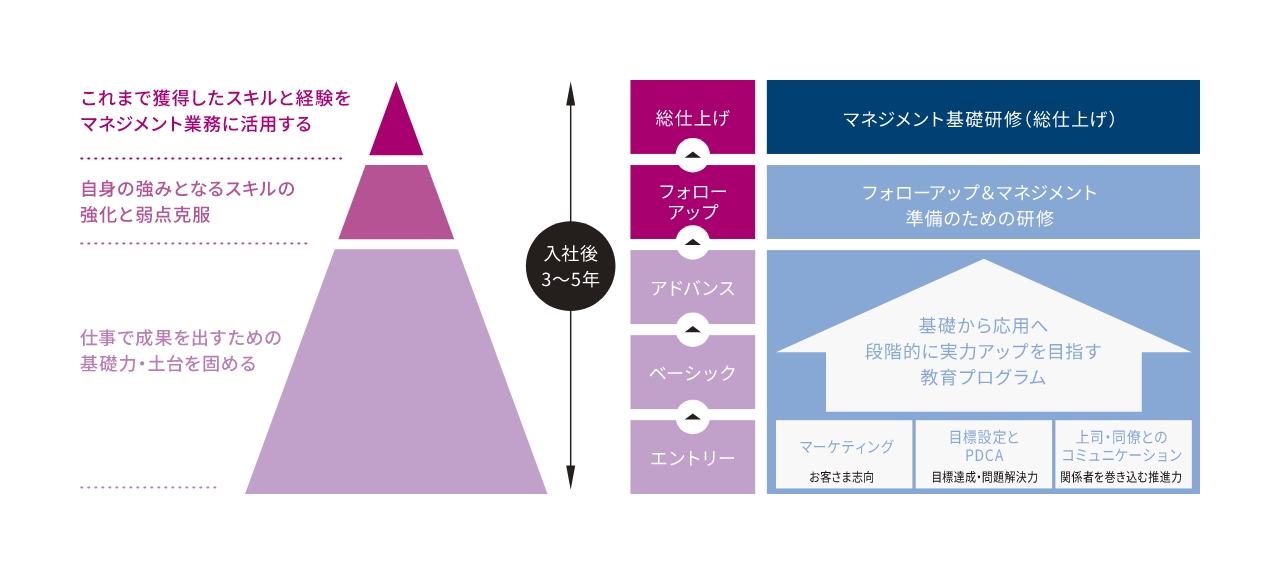 私たちは、従業員一人ひとりの力が結集することで、チームや組織の成果となり、それが企業としての価値向上に繋がると考えています。教育体系も、変化する社会や仕事のあり方に合わせて進化し続けています。たとえば、入社後の大切な時期に、基礎から応用まで段階的に学べる仕組みを整えています。業務に必要なスキルはもちろんのこと、「お客さま目線で判断する力」「自ら考え、問題を解決する力」「チームで成果を出す力」といった力も早期に徹底して磨けるような体系となっています。